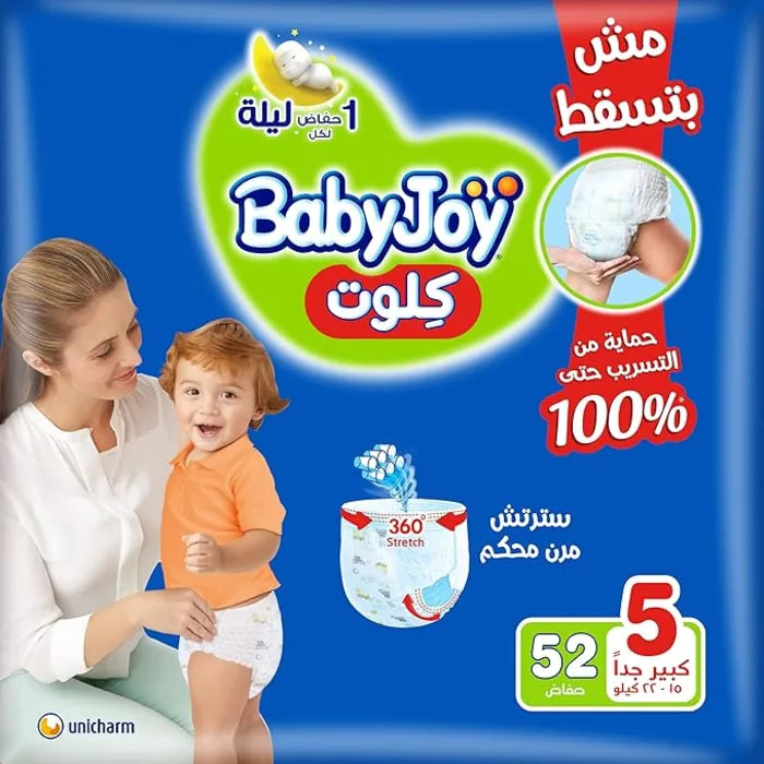 سروال بيبي جوي بحزام خصر مطاطي ناعم ومريح يجعل تغيير الحفاضات سهلاً مثل ارتداء الملابس الداخلية \nسروال بيبي جوي مريح ويناسب جسم الطفل ولا يترك علامات على الحفاضات \nيمتص سروال بيبي جوي 6 أكواب من البول لحماية طويلة الأمد من التسرب \nيستمتع الأطفال بالحركة في جميع الأوقات \nصُمم سروال بيبي جوي لجعل تجربة تغيير الحفاضات ممتعة للأم والطفل