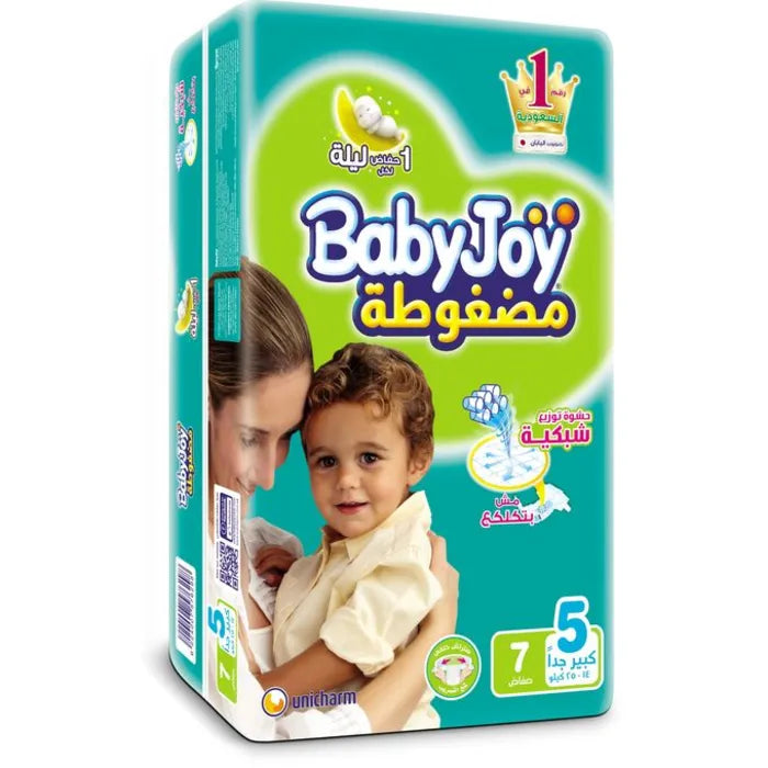 \nالميزات \nمع بدء الأطفال في تطوير مهارات الحركة الجديدة، توفر حفاضات بيبي جوي الراحة وحرية الحركة والقدرة الفائقة على منع التسرب \nتتميز حفاضات بيبي جوي بوسادة الماس التي تنشر وتمتص 6 أكواب من البول داخل الوسادة مما يمنح طفلك جفافًا إضافيًا للاستخدام لفترة أطول وحماية إضافية ضد التسرب \nحفاضات بيبي جوي مضغوطة ولا تتشوه حتى بعد امتصاص كمية كبيرة من البول للحفاظ على راحة طفلك دائمًا \nتتميز حفاضات بيبي جوي الجديدة بمادة جديدة لطيفة على البشرة وناعمة كالحرير \nتتميز حفاضات بيبي جوي الجديدة بملمس حريري وغطاء وسادة الماس الذي يمتص البول بسرعة ويحبسه للحماية من الجفاف بشكل أسرع وأكثر \nالجفاف السريع لحفاضات بيبي جوي يجعل طفلك سعيدًا ومريحًا وجافًا طوال اليوم