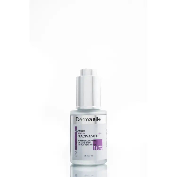 Dermaelle Niacinamide 10% Serum \n يحتوي على تركيز قوي من فيتامين B3 (النياسيناميد) المعروف بفعاليته في توحيد لون البشرة، تقليل البقع الداكنة، والتحكم في إفراز الدهون. يعمل السيروم على تحسين مرونة الجلد، تقليل اللمعان، وتهدئة البشرة من الالتهابات.