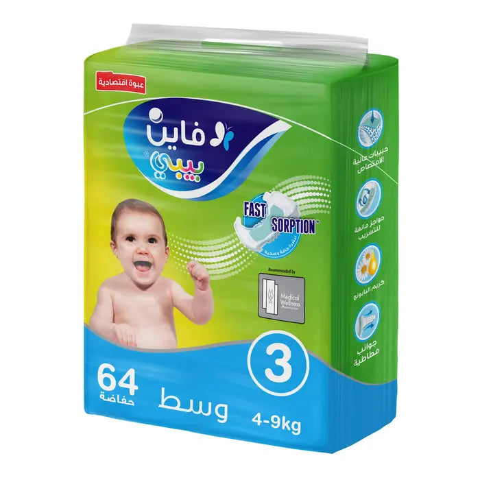 توفر حفاضات فاين بيبي الجديدة والمحسّنة لطفلك جفافًا يدوم لفترة أطول، مع مساعدتك على توفير المزيد \nبفضل تقنية القفل المزدوج والجوانب القابلة للتمدد وحواجز التسرب ولب الجل فائق الامتصاص، تساعد على منع التسربات حتى يشعر طفلك بالراحة طوال اليوم والليل \nإنها غنية بغسول البابونج ولها طبقة خلفية قابلة للتنفس تضمن أقصى قدر من النعومة القطنية للحفاظ على صحة بشرة طفلك \nإنها الحفاضة الوحيدة في العالم التي أوصت بها الجمعية الطبية للصحة