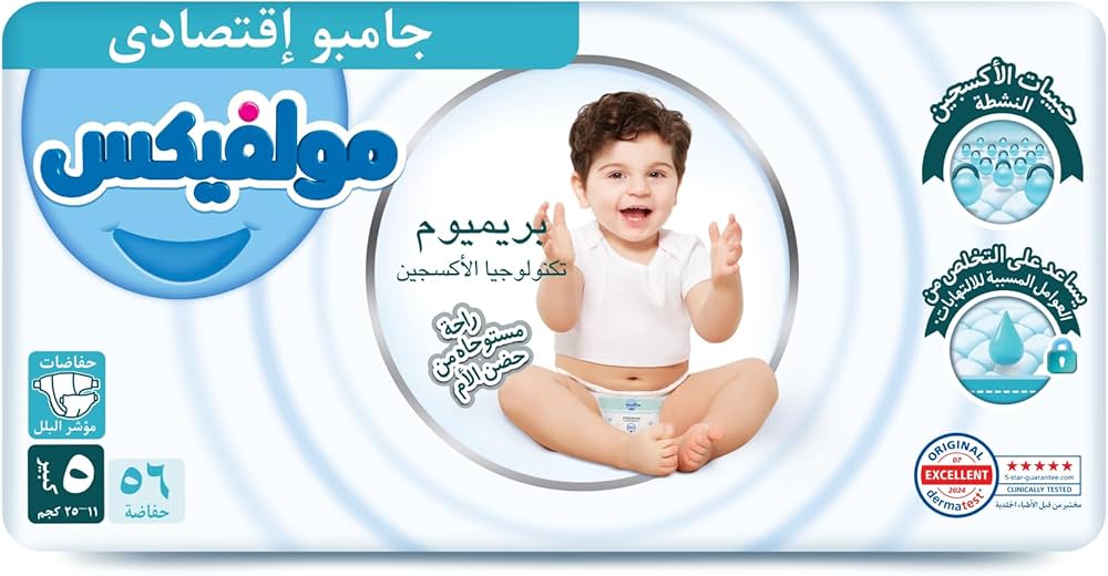 حفاضات مولفيكس أوكسيجين – مقاس 5 – للأطفال من 11 إلى 18 كجم. بتقنية التهوية الفعالة اللي بتحافظ على جفاف وراحة بشرة طفلك. مزودة بحواف مطاطية ناعمة تمنع التسرب وتوفر راحة كاملة للحركة، مع ملمس خارجي لطيف على البشرة الحساسة.