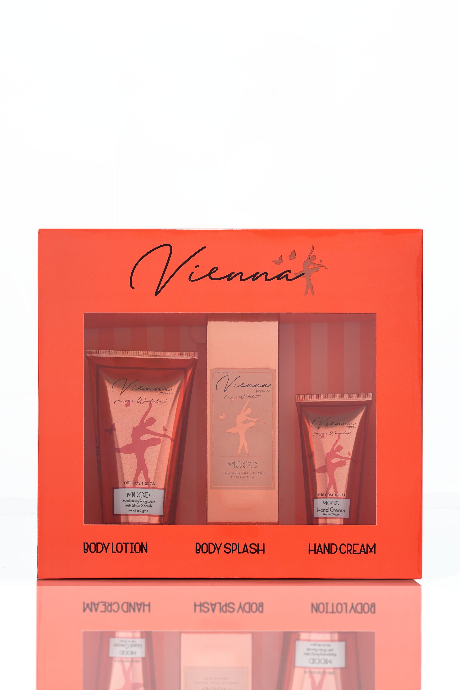 مجموعة مود فيينا النسائية (لوشن للجسم ١٥٠ مل + معطر للجسم ٢٢٠ مل + كريم لليدين ٥٠ جم)، مصممة خصيصاً لتدليل حواسك من الرأس إلى القدمين. تتضمن هذه المجموعة الرائعة ثلاثة منتجات أساسية مصممة لتغذية بشرتكِ وإنعاشها وترطيبها، لتمنحكِ شعوراً بالانتعاش ورائحة زكية. تحتوي مجموعة مود فيينا النسائية على: