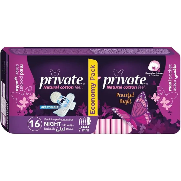فوط برايفت ماكسي الليلية 16 قطعة | حماية فائقة لليالي الهادئة \nبتصميمها الفريد وامتصاصها القوي \n✅ تصميم ماكسي لحماية كاملة | ✅ نظام لتوزيع مثالي للسوائل | ✅ نعومة مثالية للبشرة الحساسة