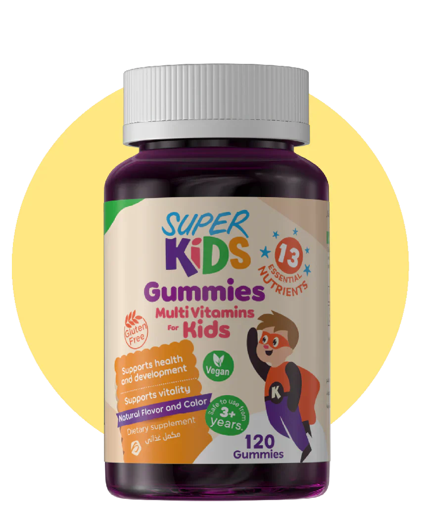 Super Kids Gummies يحتوي على مجموعة متوازنة من الفيتامينات والمعادن الأساسية التي تساعد في تقوية المناعة، دعم التركيز، وتحسين الطاقة والنشاط اليومي – وكل ده بطعم بيحبه الأطفال!