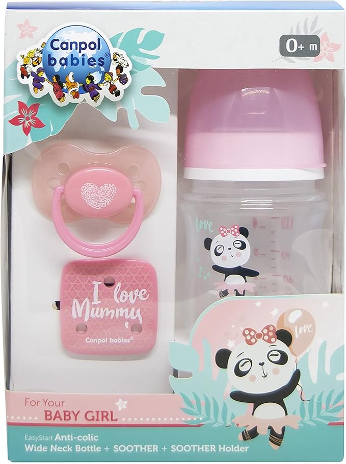 A practical and modern set from Canpol Babies designed for infants: includes a 120 ml EasyStart wide-neck bottle with a silicone nipple suitable for 0+ months, a symmetrical silicone soother (0-6 months), and a safety clip for easy use. All pieces are BPA-free for your baby’s safety, in a fresh pink color.